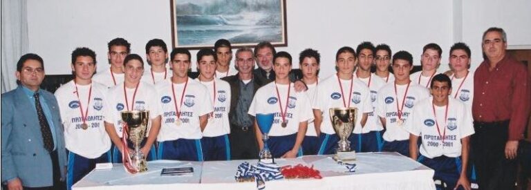 Share Facebook Twitter LinkedIn Pinterest Email WhatsApp Η ομάδα παίδων την σεζόν 2000/01 όπου στέφθηκε πρωταθλήτρια υπό την καθοδήγηση των τότε υπεύθυνων των ακαδημιών μας Γιαννάκη Γιαγκουδάκη, Βάλτερ Βέβή και Λάμπρου Μερκή. Διακρίνεται επίσης και ο τότε έφορος Δήμος Δημοσθένους.