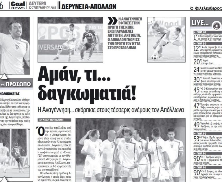 Το ρεπορτάζ της αθλητικής εφημερίδας «Goal» την επομένη του αγώνα στο «Τάσος Μάρκου» με αντίπαλο την Αναγέννηση Δερύνειας στο πλαίσιο της 2ης αγωνιστικής της σεζόν 2011/12!
