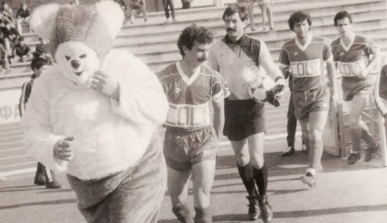 Mid-80’s και μια από τις πιο χαρακτηριστικές στιγμές που βίωνες όταν αγωνιζόταν η ομάδα μας εντός έδρας!  Ο Θρυλικός μπούλουκος να προπορεύεται της ενδεκάδας,  το αιώνιο περιβραχιόνιο Γιαννάκης Γιαγκουδάκης και πίσω του οι πολεμιστές του!