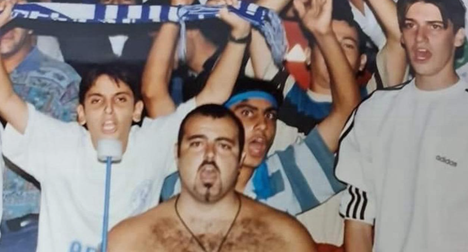 Στα δεξιά του, ο Χρήστος Καυκαλιάς, τότε ακόμη μαθητής, κουβαλάει στο βλέμμα του εκείνο το ανόθευτο πάθος που γεννιέται μόνο στις κερκίδες. Σχηματίζεται στο πρόσωπό του μια έκφραση που δεν χρειάζεται λέξεις: είναι ο ενθουσιασμός του νεαρού που ξέρει ότι ζει κάτι μεγαλύτερο από τον εαυτό του, κάτι που θα κουβαλάει για μια ζωή.